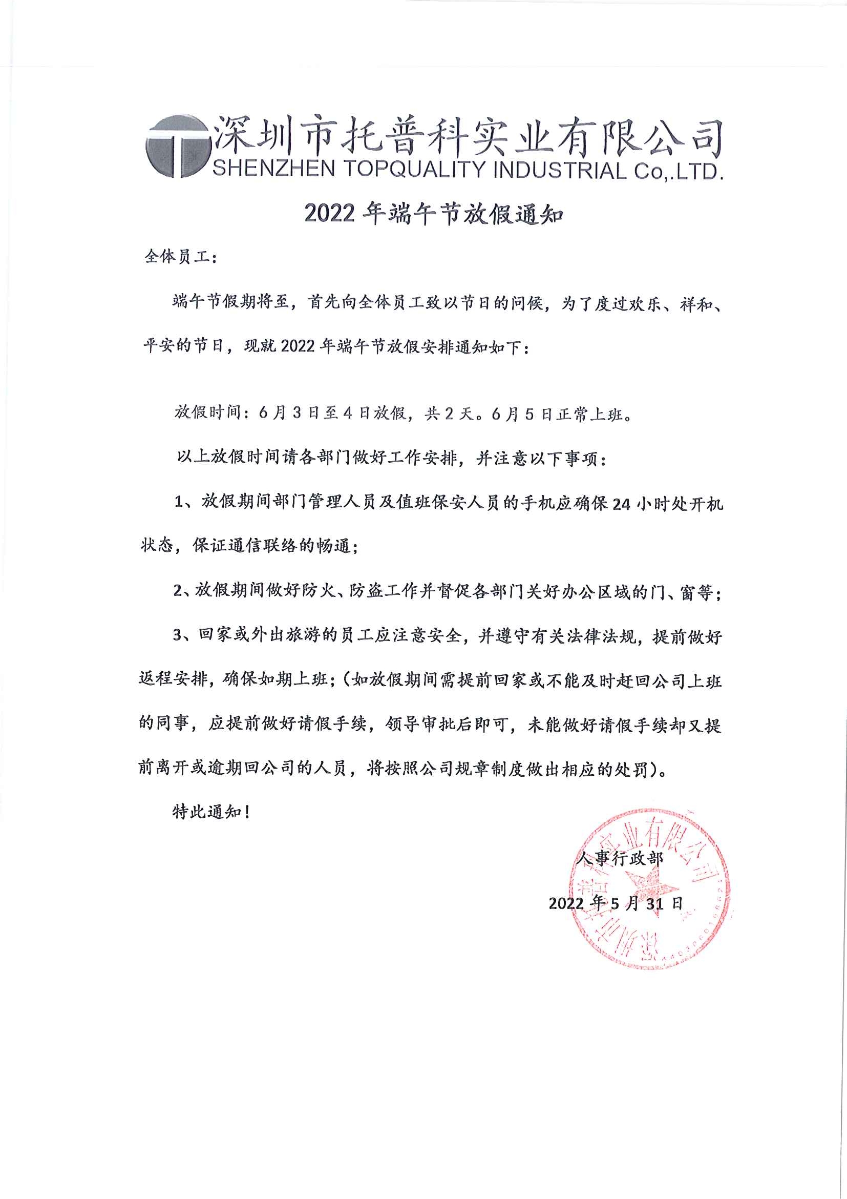 深圳托普科2022年端午節(jié)放假通知