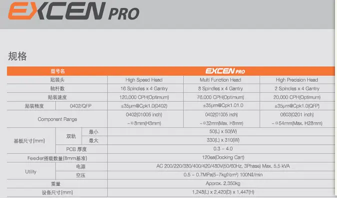 EXCEN PRO是三星貼片機(jī)的一種,配有16個(gè)吸嘴,旋轉(zhuǎn)式頭部的高速模塊式貼片機(jī),它實(shí)現(xiàn)了世界同級(jí)產(chǎn)品中的最高速度120,000CPH,也實(shí)現(xiàn)了世界最高的面積生產(chǎn)性。