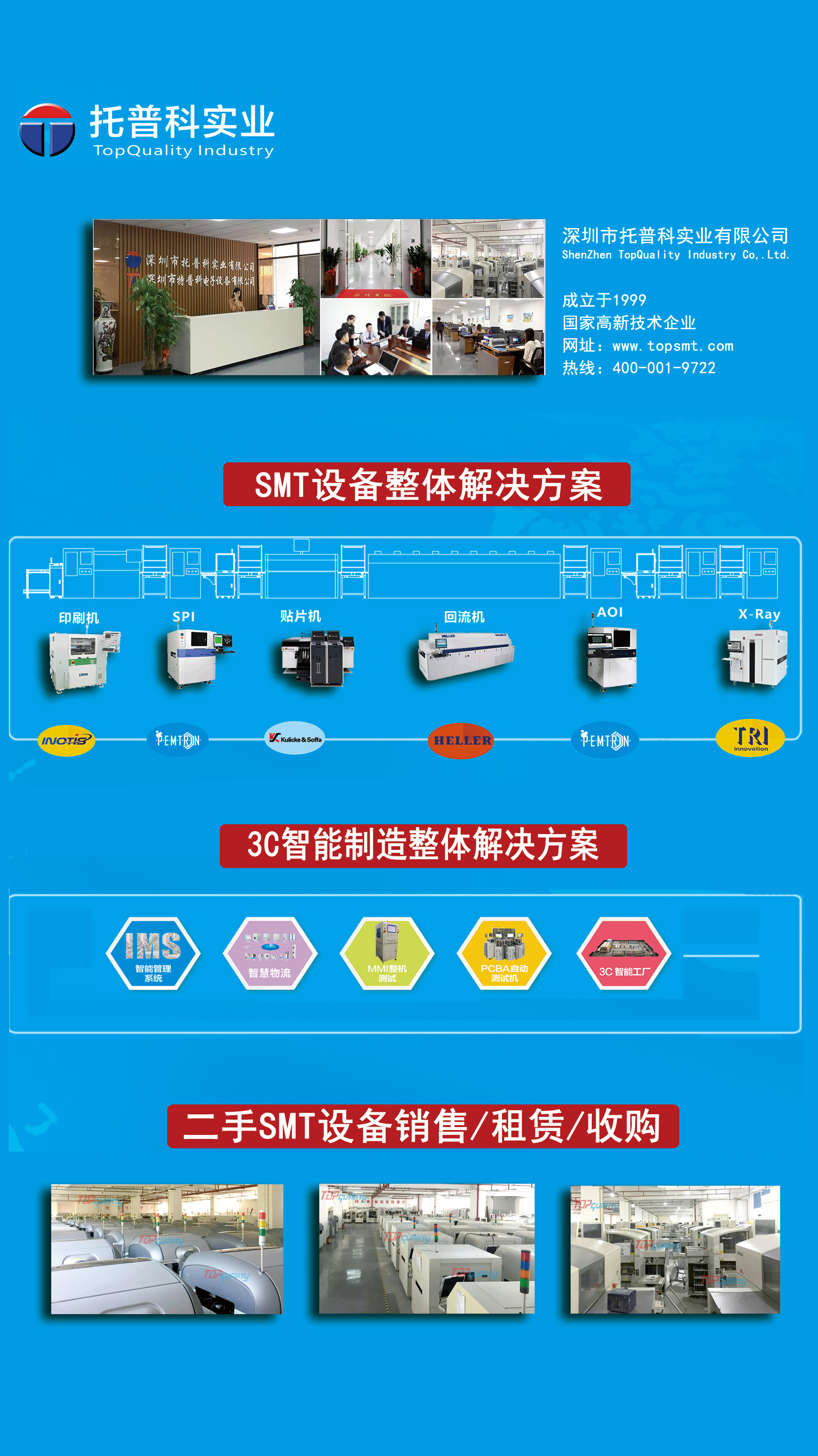 深圳市托普科實業(yè)有限公司是一家高科技術(shù)公司,專業(yè)提供二手及全新SMT設(shè)備,(貼片機,回流焊,波峰焊,印刷機,AOI,SPI)收銷/租賃/維修以及SMT周邊所有設(shè)備研發(fā)、生產(chǎn),銷售為一體,產(chǎn)品有:(上板機、下板機、接駁臺、平行移載機、雙軌機、跌板機、真空吸板機、緩存機、NG/OK收板機、印刷機、及各類工業(yè)控制系統(tǒng)開發(fā),配件銷售)提供一站式SMT貼裝解決方案。